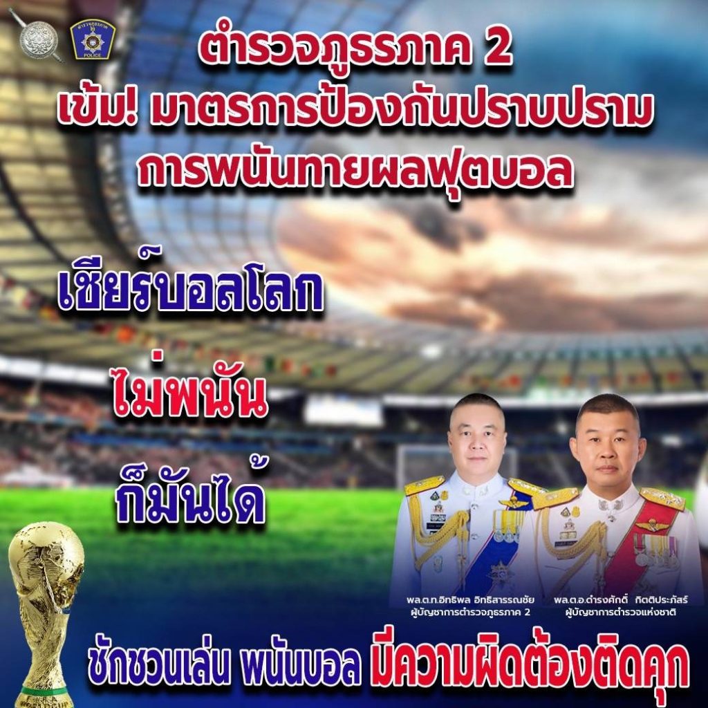 พล.ต.ต.ชัยต์พจน สูวรรณรักษ์ โฆษก ตร.ภ.2 เปิดเผยว่า ตำรวจภูธรภาค 2 รับนโยบายของ พล.ต.อ.ดำรงศักดิ์ กิตติประภัสร์ ผบ.ตร. เรื่องมาตรการป้องกันปราบปรามการลักลอบเล่นพนันทายผลฟุตบอล ช่วงมหกรรมฟุตบอลโลกที่จัดขึ้นระหว่างวันที่ 20 พ.ย.2565 – 18 ธ.ค.2565 ณ ประเทศกาตาร์